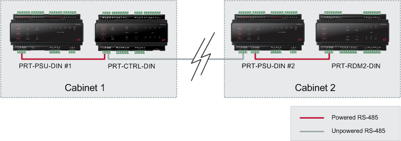 In larger installations, the Module Network power supply may need to be split to allow for load sharing between several supplies. This is done by removing the N+ connection from between split sections.