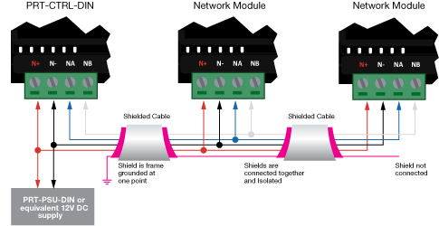 Encrypted Module NetworkThe Protege system incorporates encrypted RS-485 communications technology. Always connect the NA and NB terminals of the controller to the NA and NB terminals of the expansion devices and keypads. The N+ and N- must connect to a 12V power supply source capable of supplying the peak current drawn by all modules.