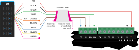 This diagram shows the connection of a standard Wiegand reader with the controller or RDM2 controlling an access door in entry or exit mode (2 doors, 2 readers).