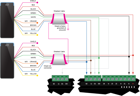 When operating in multiplex mode, the Controller or RDM2 allows the connection of 4 Wiegand reading devices controlling two doors each with entry/exit readers. The secondary reader will have all connections wired to the same port as the primary card reader with the DATA 1 connection wired to the opposite reader connection DATA 1 input. |