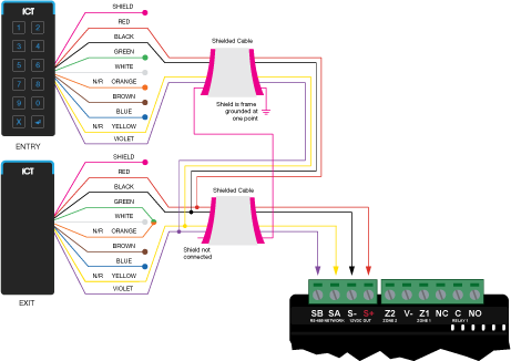 This diagram shows the connection of two RS-485 readers connected to provide an entry/exit configuration using the PRT-WX-DIN-1D controller. The Exit reader has the green and orange wires connected together.