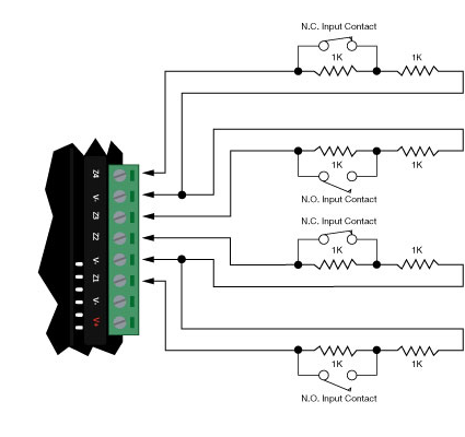 The PRT-WX-DIN controller allows the connection of up to 4 contacts for monitoring and controlling 2 access control doors.Each input on the Controller can be used for the door function that is automatically assigned and as a normal input on the system. This example shows the connection of a normally closed door position monitoring contact to monitor the Open, Closed, Forced and Alarm conditions of the door. |
