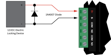 The lock output is shared with the bell/siren function. You can select another output for the lock control if the bell/siren function is required. To use the lock outputs in conjunction with the onboard reader module, the Lock output for the door associated with the reader port must be configured to be the desired lock output on the controller. This is not configured by default. When using a door with an Entry and Exit Reader, the lock output should be connected to the Bell (CP001:01), and the swap lock option for the second reader input should be enabled to allow the reader LEDs to display the correct status. Note: The Bell output current must not exceed 1.1A or electronic shutdown will be engaged. |