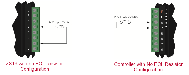 When using the No Resistor configuration, the controller only monitors the opened and closed state of the connected input device generating the alarm and seal conditions.