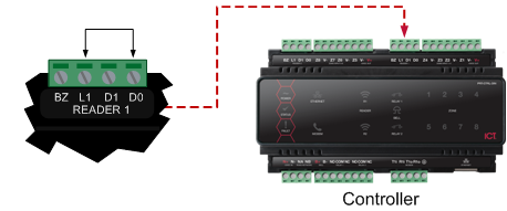 - Connect a wire link between the Reader 1 D0 input and the Reader 1 L1 output