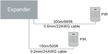 The maximum distance between an expander and any security detection device is 300m or 985ft.