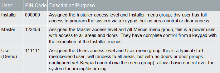 You can use and edit the defaults provided, or create your own to suit your needs. For security reasons, you should always change the PIN codes after the initial setup. |