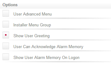 - Show User Alarm Memory On Logon: When enabled, the user will be shown any alarms that are in the memory when they log in to the keypad.