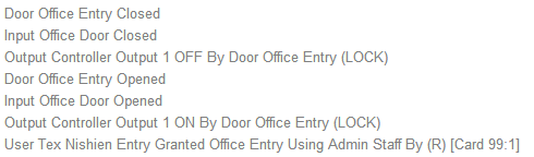 Door Processing: Door SenseIf you badge a programmed card at a reader then open Input 1 for that reader for a second or two, you will see Door Opened and Closed events.