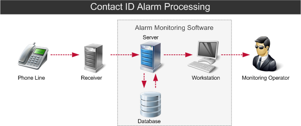 Traditional Analog CID MonitoringThe controller dials the monitoring station, waits for the handshake tone before transmitting the CID string, then waits for the kiss-off tone from the receiver. The monitoring station picks up these messages, looks up the account details on its database, and displays the alarm to the operator. As Contact ID only sends a bunch of numbers representing account, area and zone, the monitoring operator relies on the database inside the monitoring software being accurate. The information they receive is only ever as good as that provided by the technician during installation. |