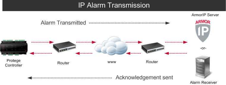 IP alarm monitoring has been developed to achieve the same thing as Contact ID alarm monitoring (to transmit an alarm message to a central monitoring station), only it does this via a network connection across the internet.