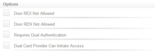 Door Type OptionsREX and REN can also be disabled from the Options tab. These options override settings at the reader expander. Using the operating schedule of a door type, it is possible to allow REX/REN events at certain times of the day or disallow the at other times. |