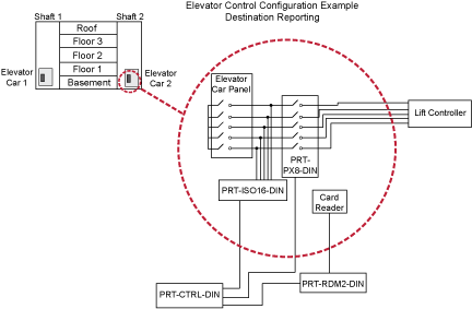 Any system input can be used for destination reporting, however the PRT‑ISO16‑DIN module has been specifically designed for this purpose. Each input is optically isolated and looks for a voltage between 12V and 230V AC or DC rather than an EOL resistor. Standard inputs should only be used if clean contacts are supplied by the elevator control system. |