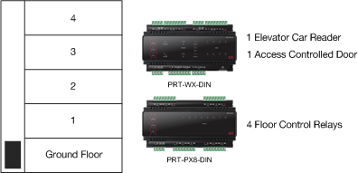 Example: 1 Car, 4 Floors, Door ControlIn this example, we need 2 reader ports - one for the elevator car reader, and one to provide standard door access control - so are using a standard PRT-WX-DIN Controller. We've chosen a PRT-PX8-DIN to provide the 4 floor control outputs, and can use the remaining 4 outputs for other purposes such as lighting control or sirens. Controllers and Reader Expanders can be used to provide elevator control and door access control simultaneously |