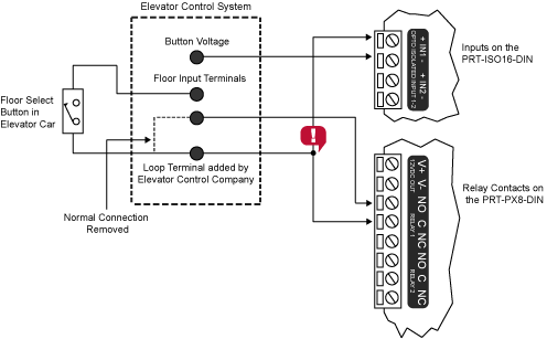 Fail secure destination reporting requires an additional wire from the contacts of the relay to the input terminal on the PRT-ISO16-DIN. A button voltage common wire is also required from the elevator control system.
