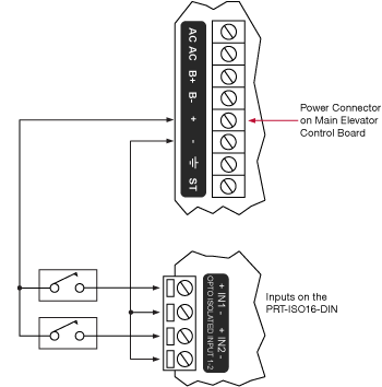 Installations that use destination reporting can be complicated and require careful planning. We recommend consulting the elevator company well in advance of providing a solution to your client, and that you also configure and setup a unit with destination reporting enabled using the simple test circuit shown. This will allow you to understand the principles and operation of the unit prior to the installation taking place.