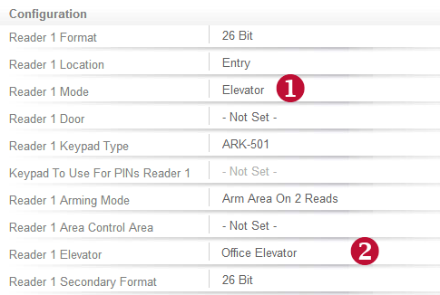 Card readers are located inside the elevator car and require an associated reader expander to facilitate access control. For every elevator car, you need one reader port. Navigate to Expanders | Reader Expanders, select Office Elevator then click the Reader 1 tab.