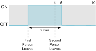 With our earlier example of external lighting control, when the first person leaves the building, the lights are turned on and the 5 minute timer begins. If a second person leaves 4 minutes later, the lights would normally turn off 30 seconds after, as the second On request is ignored. |