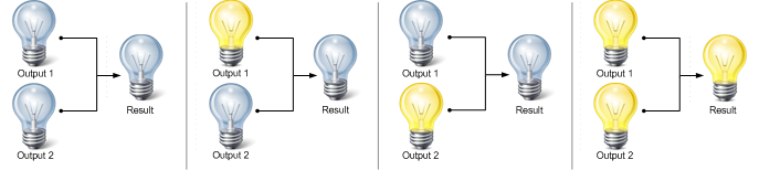 The Follow Logic AND programmable function performs a logical AND operation on output 1 and 2 with the controlled output changing state according to the result. The controlled output only turns on if both of the checked outputs are on. The controlled output turns off if either or both of the checked outputs are off. |