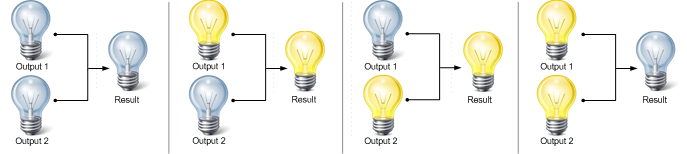 Follow Logic XORThe Follow Logic XOR (Exclusive OR) programmable function performs a logical XOR operation on output 1 and 2 with the controlled output changing state according to the result. The controlled output turns on if only one of the checked outputs is on. The controlled output turns off if both, or neither of the checked outputs are off. |