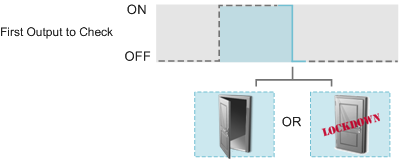 Inverted Follow Pulse Off OutputThe Inverted Follow Pulse Off Output action locks (or clears the lockdown) on the controlled door only once the checked output has transitioned from an on to an off state When the checked output turns on, the state of the door does not change as this function is only evaluated at the OFF edge. |