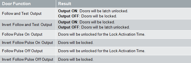 The table below demonstrates the resulting door/door group state when the Emulate Unlock Menu mode is selected and used in conjunction with the following door function modes.
