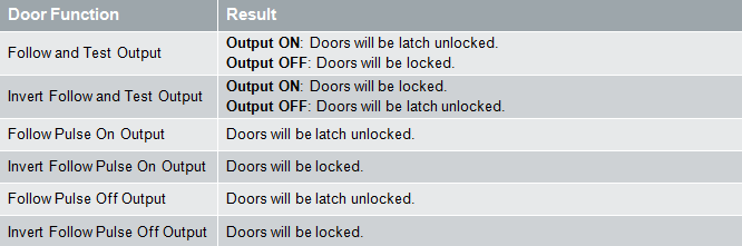 The table below demonstrates the resulting door/door group state when the Latch Door Unlock mode is selected and used in conjunction with the following door function modes.