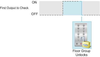 Follow Pulse Off OutputThe Follow Pulse Off Output action unlocks the controlled floors only when the checked output has transitioned from an on to an off state. When the checked output turns on, the state of the floor group's state does not change as the this function is only evaluated at the OFF edge. |