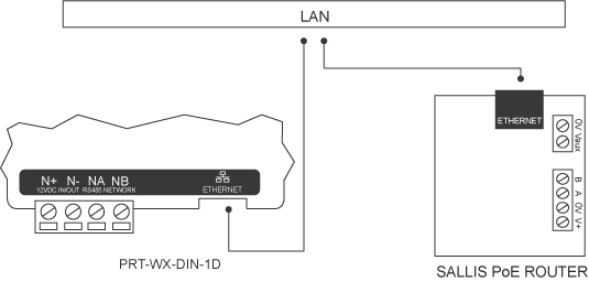 The Single Door Controller can be connected to a Salto PoE Router via a PoE switch. This configuration provides the router with a network connection and a power supply. If a PoE switch is not used, power can be supplied to the router via an auxiliary power source that supplies 500mA at 12VDC. This power supply is directly connected to the router via the 0V and Vaux ports. |