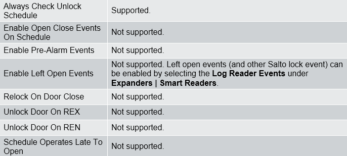 The following shows the options that are supported/unsupported by SALLIS locks under the Programming | Doors | Options menu.