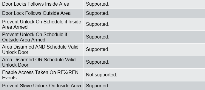 The following shows the options that are supported/unsupported by SALLIS locks under the Programming | Doors | Options menu.